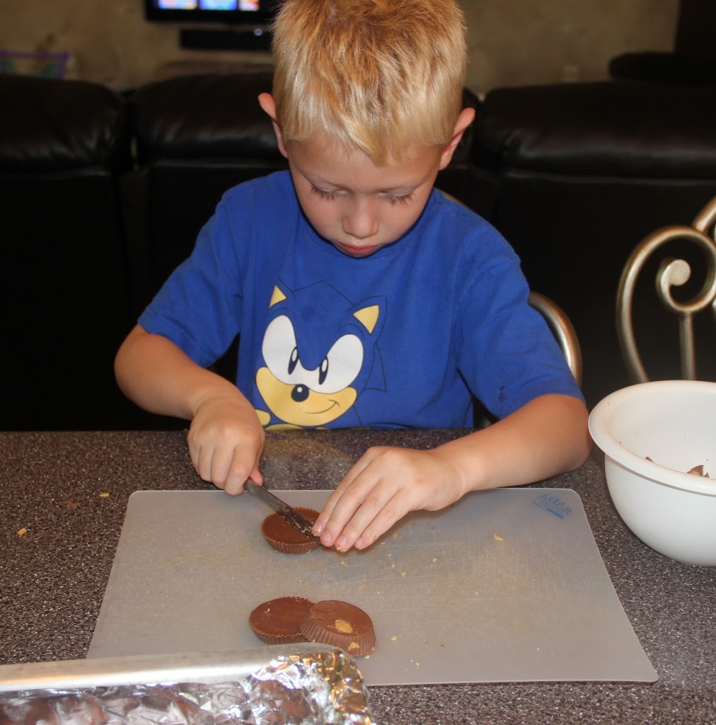 While you melt the chocolate mixture, have your assistant start cutting up the last package of peanut butter cups (the 12 remaining cups). Don't worry, he's using a butter knife and he's starting 4K this fall. He's already a pro at cutting up Playdoh, why not peanut butter cups? He did a great job. Just throw these into a bowl and hang onto them. We're not quite ready to use them yet.