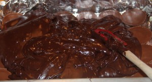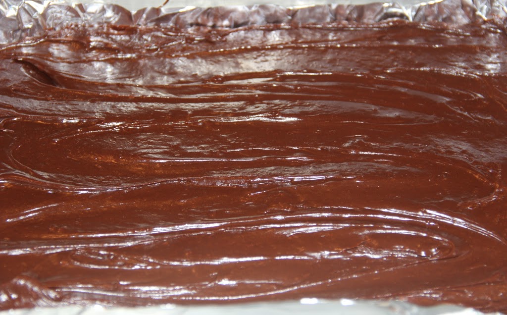 Spread the chocolate (covering all of the cups) all of the way to the corners of the pan.