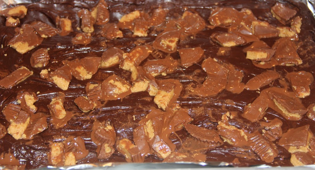 - Take the bowl of cut-up Reese's cups and sprinkle them over the top of the fudge mixture, pressing them into the chocolate ever so slightly. The deeper you push them in, the more they will melt. If you want a chunkier bar, just basically let them sit on top of the fudge.