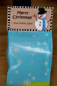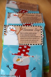 Last week when I was out shopping I ran across some cute snowman favor bags at Walmart, so I grabbed them. Then, while out on Pinterest I ran into a pin for these cute Snowman Soup printable tags from Kate Hadfield Designs. She offers printable tags and recipe cards with text, and then the same designs without the text. I adored the design and thought they would be a great addition to the treat bags.