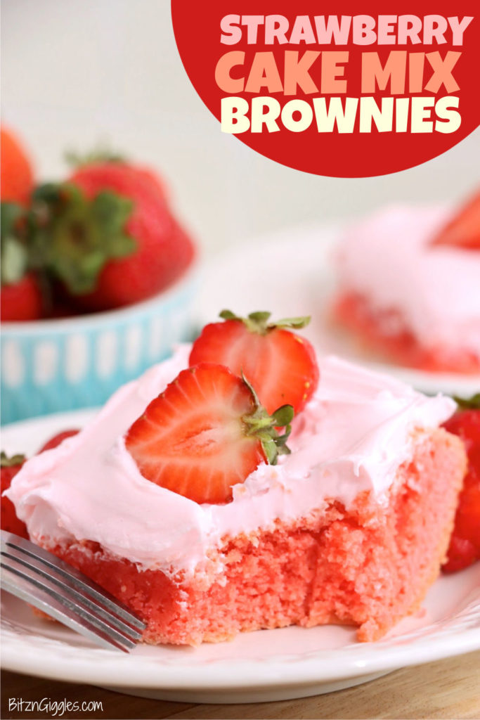 Strawberry Cake Mix Brownies - Sweet and simple brownies made with strawberry cake mix, covered in whipped strawberry frosting, and topped with fresh sliced strawberries.