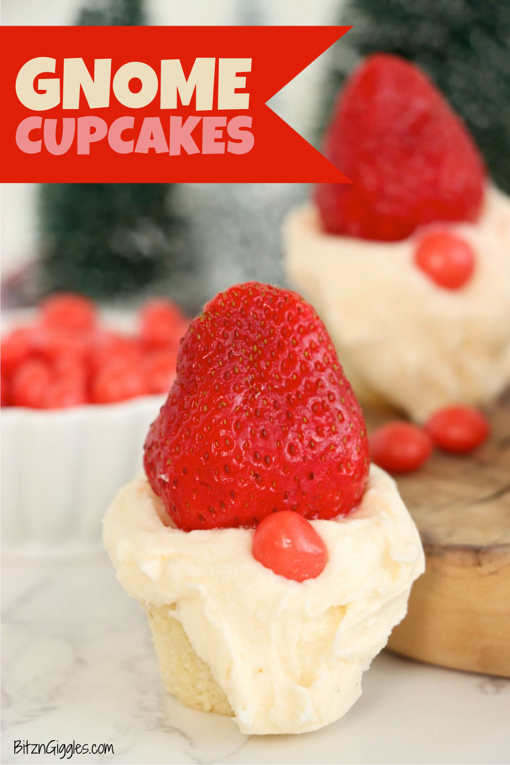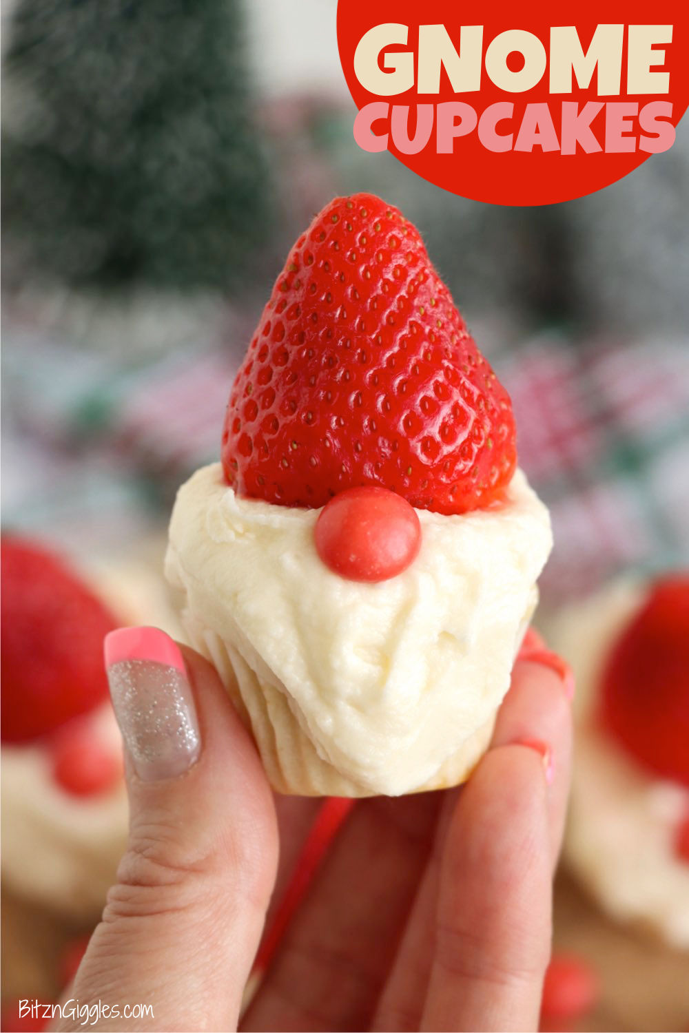 Strawberry Gnome Cupcakes - Scrumptious vanilla cupcakes topped with sweet frosting and fresh strawberries make for a festive gnome-themed holiday treat that's adorable and absolutely delicious!