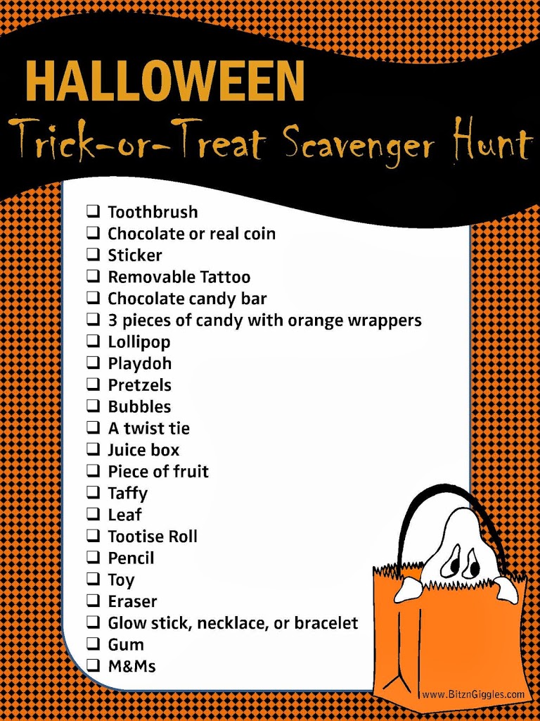 So, you may have heard of Halloween scavenger hunts where you actually look for items to cross off your list while you're trick-or-treating. Pumpkins, certain costumes, spider decorations, etc. In my opinion, the kids already have enough going on in their heads. It's doubtful they'll hang onto a sheet and a pencil. The scavenger checklist will probably get tossed into the gutter (literally, on your street) soon after they leave the house. If going door-to-door, ringing bells, seeing other kids in costumes and receiving treats at every home they visit doesn't provide enough entertainment and excitement, I'm not sure what will. Good luck to the parents of the child who is bored during trick-or-treating. You have many challenging years ahead.