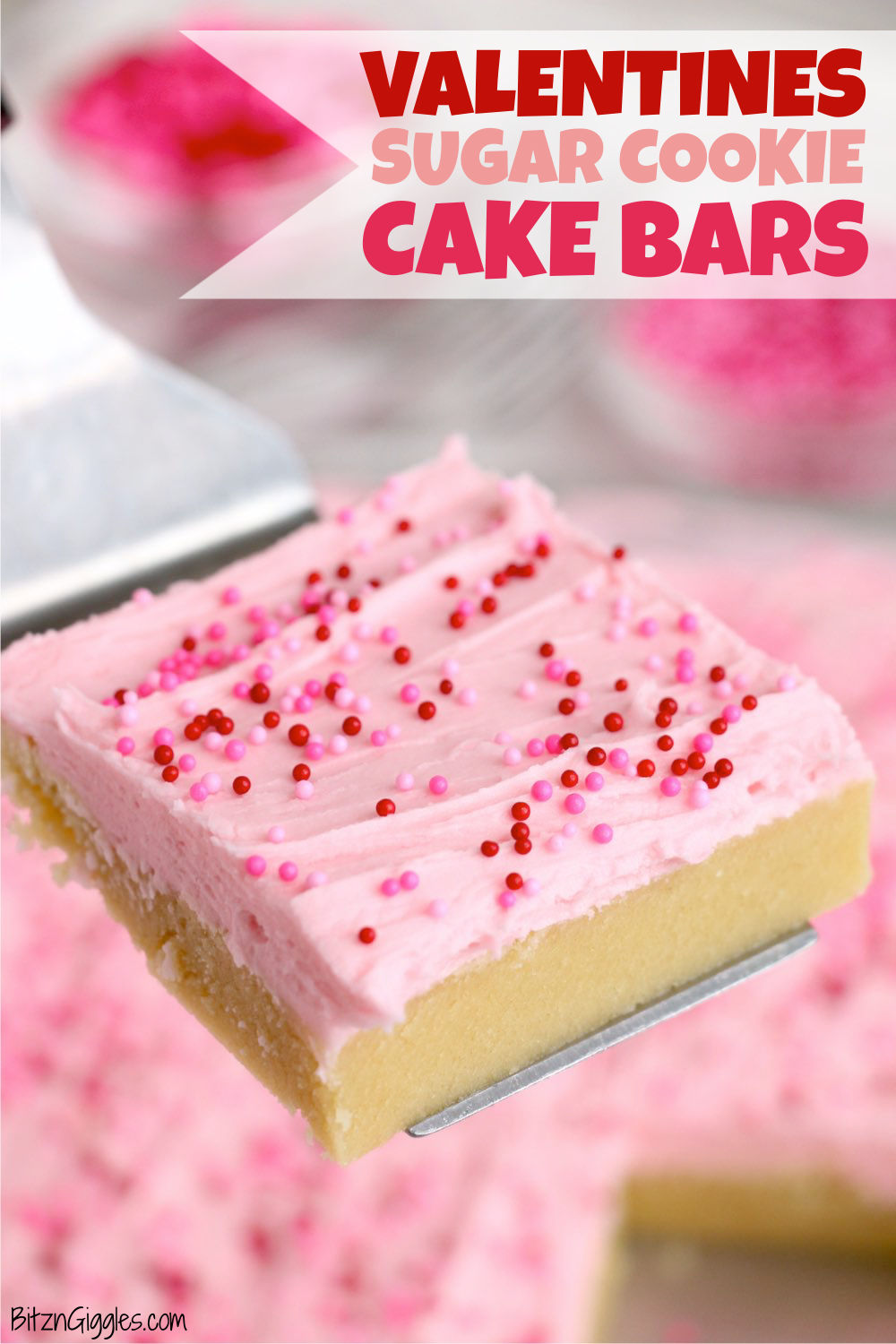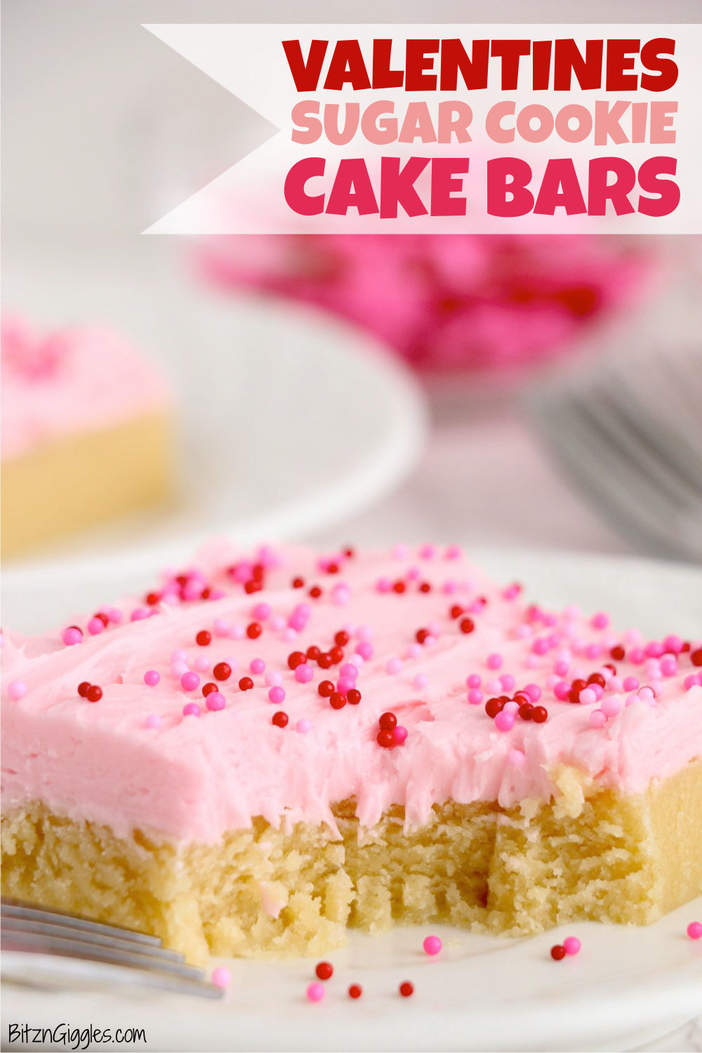 Valentine's Sugar Cookie Cake Bars - Soft and chewy sugar cookie cake bars covered with buttercream frosting and decorated for Valentine's Day!