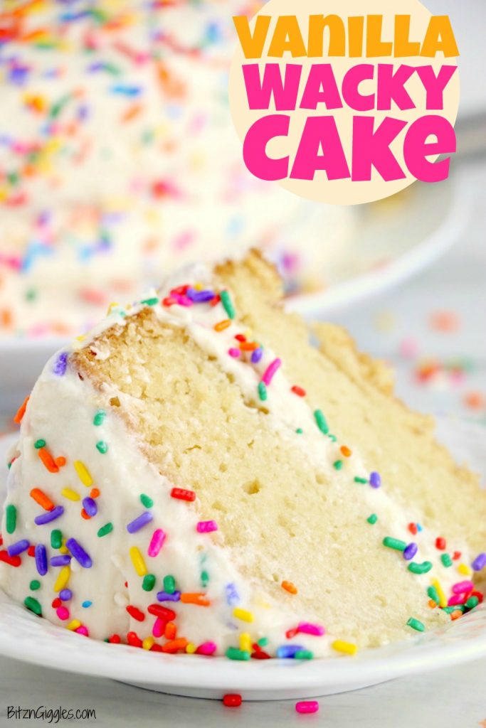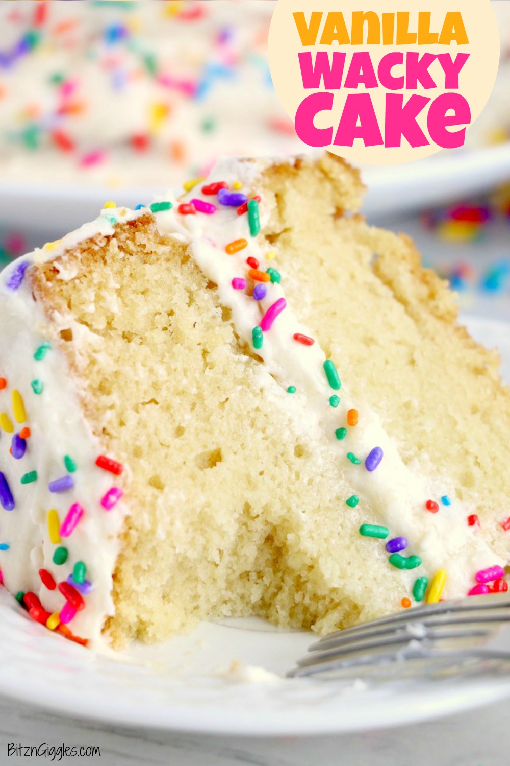 Vanilla Wacky Cake - Also known as Depression Cake or Crazy Cake, this vanilla cake comes together quickly without the need for eggs, butter or milk!