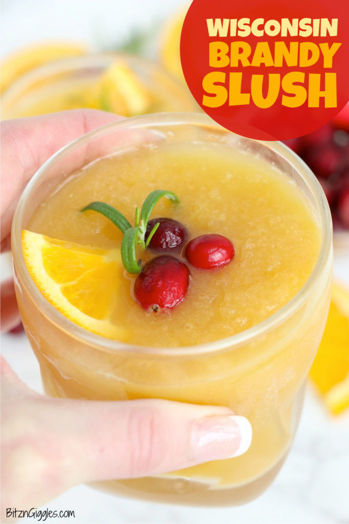 Wisconsin Brandy Slush - A frozen, boozy slush mixed with lemon-lime soda and garnished with fresh fruit. This is the classic, tried-and-true Wisconsin recipe! Perfect for parties and entertaining large groups!